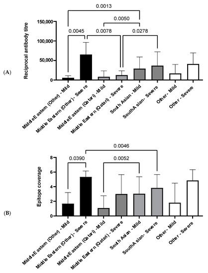 The relationship between ethnicity, antibody titers, and epitope coverage was assessed, and the results are summarized in Figure 5. Of all ethnic groups assessed, the Middle Eastern ethnicity group, excluding Qatari, was the only group to display a significant increase in both antibody titers and epitope coverage in patients with severe disease in comparison to patients with mild disease (Figure 5).