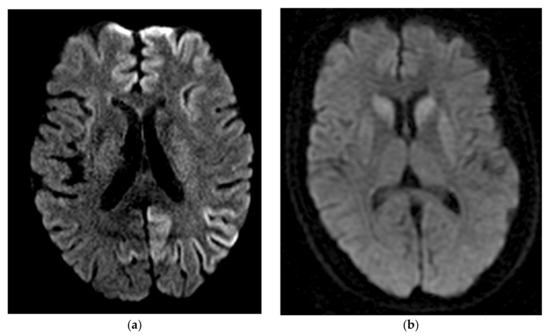 - Vitali, P.; Maccagnano, E.; Caverzasi, E.; Henry, R.G.; Haman, A.; Torres-Chae, C.; Johnson, D.Y.; Miller, B.L.; Geschwind, M.D. Diffusion-Weighted MRI Hyperintensity Patterns Differentiate CJD from Other Rapid Dementias. Neurology 2011, 76, 1711–1719. [Google Scholar] [CrossRef] [PubMed]