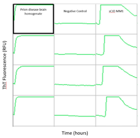 Real-time quaking-induced conversion reactions seeded with prion disease brain homogenate, and cerebrospinal fluid from a negative control and a positive result from a patient with the MM1 subtype of sporadic Creutzfeldt–Jakob disease (sCJD MM1). Each sample is run in quadruplicate, organized vertically. Thioflavin T (ThT) fluorescence, indicative of amyloid formation, is measured over time. In the positive sCJD MM1 CSF sample, ThT fluorescence initially increases due to amyloid formation, followed by a characteristic decline thought to be due to self-quenching.