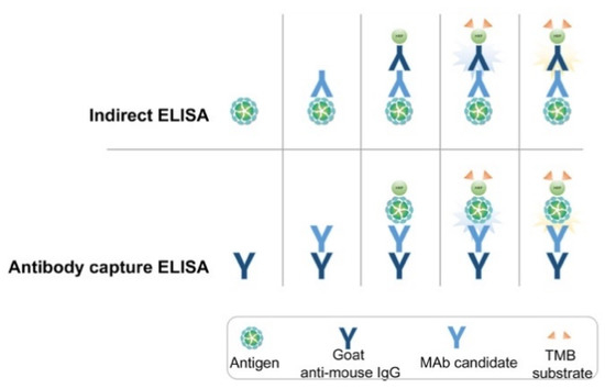 Schematic representation of indirect and antibody-capture ELISA assays used for screening and selection of MAb pairs.