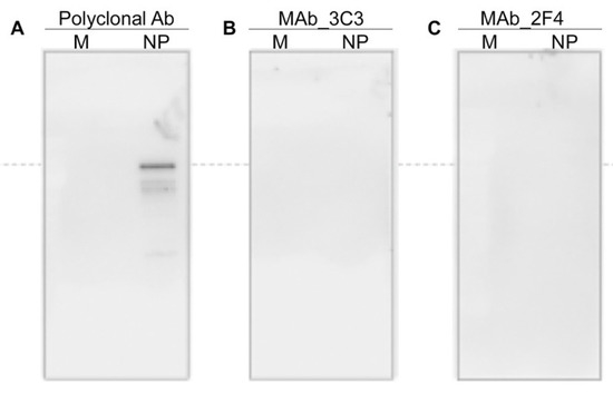 Western blot analysis to show the ineffectiveness of screening of MAbs through indirect ELISA. (A) Treated with polyclonal Ab against NP, (B,C) treated with MAbs.