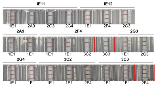 Selection of MAb pairs through sandwich LFA method. The effective MAb pair is marked with red-colored boundaries.