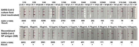 The analytical sensitivity of the GenBody™ COVID-19 Ag test was evaluated following the procedures described in the materials and methods. The TCID50/mL of the inactivated SARS-CoV-2 for the corresponding lowest G20 positive value was determined to be 6.93 × 101 whereas, 0.39 μg/mL of the recombinant SARS-CoV-2 NP represented the lowest corresponding G20 positive value (Figure 6). Thus, the LOD of the GenBody™ COVID-19 Ag test (COVAG025) was determined to be 6.93 × 101 TCID50/mL for inactivated SARS-CoV-2 and 0.39 μg/mL for recombinant SARS-CoV-2 NP.
