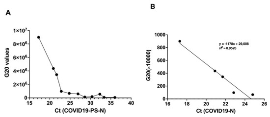 Correlation analysis of G20 values of RDT strip with the corresponding Ct values (SARS-CoV-2-N gene) of the samples. (A) Inter-dependance between G20 values and Ct values, (B) linear regression analysis.