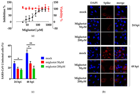 3.1. Anti-SARS-CoV-2 Activity of Miglustat in Vero E6 and Huh7 Cells