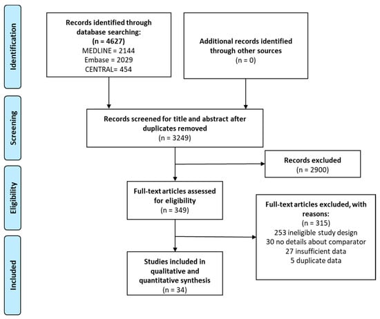 Our search strategy yielded 4627 studies from the three databases. After duplicate removal, we screened 3249 articles by title, abstract and full text, out of which 34 [12,21,22,23,24,25,26,27,28,29,30,31,32,33,34,35,36,37,38,39,40,41,42,43,44,45,46,47,48,49,50,51,52,53,54] were eligible for meta-analysis. No additional reports were identified in the primary eligible studies’ reference lists. The search and selection process are presented in Figure 1.