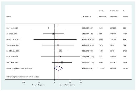 - Du, H.W.; Chen, J.N.; Pan, X.B.; Chen, X.L.; Fang, S.F.; Li, X.Q.; Xia, P.C.; Gao, L.; Lin, H.L.; Chen, L.M.; et al. Prevalence and outcomes of re-positive nucleic acid tests in discharged COVID-19 patients. Eur. J. Clin. Microbiol. Infect. Dis. 2021, 40, 413–417. [Google Scholar] [CrossRef] [PubMed]
