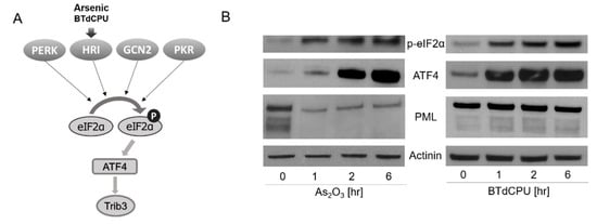 Arsenic and BTdCPU activate the p-eIF2α-ATF4 pathway in a lymphoma cell line. (A) A diagram illustrating how arsenic and BTdCPU activate the p-eIF2α-ATF4 pathway. (B) BX1-Akata cells were treated with 10 µM As2O3 or BTdCPU for the indicated time period, and expression of p-eIF2α, ATF4, and PML protein accumulation were determined by western blot. The cell lysate proteins on the blot were also incubated with actin antibodies.