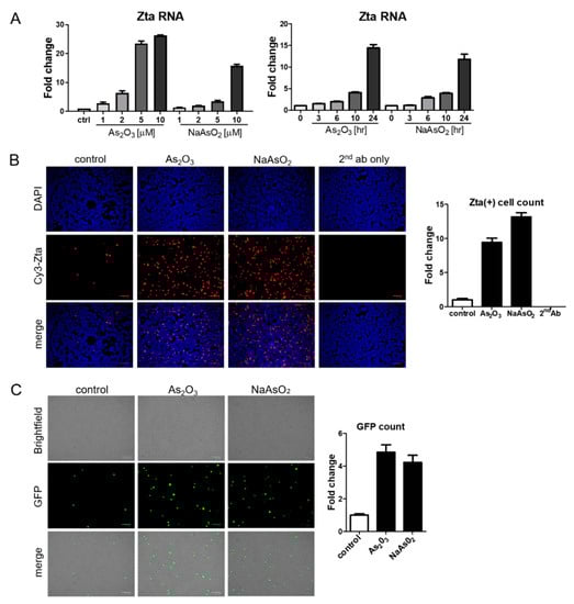 Arsenic induces EBV Zta expression in a lymphoma cell line. (A) BX1-Akata cells were treated with the indicated concentrations of As2O3 or NaAsO2 for 24 h, and isolated RNA was used for qRT-PCR with Zta primers (Left). BX1-Akata cells were treated with 10 µM As2O3 or NaAsO2 for the indicated time periods, and qRT-PCR was performed to detect Zta RNA levels (Right). (B,C) BX1-Akata cells were treated with 10 µM As2O3 or NaAsO2 for 24 h. Fluorescence was used to assess Zta (B) and GFP expression (C) following treatment. All scale bars on the bottom right represent 100 μm. Fold changes in numbers of positive cells are quantitated in the side panels.