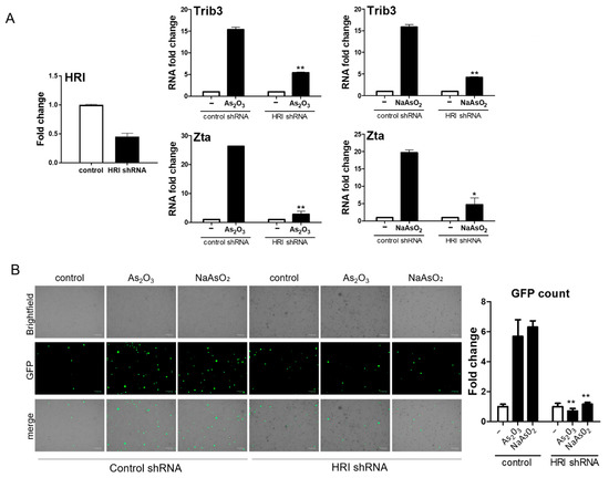 shRNA knockdown of HRI reduces EBV Zta activation by arsenic. BX1-Akata cells were transduced with shRNA lentiviral vectors designed to knockdown HRI gene expression or control shRNA lentiviral vectors. (A) HRI knockdown was confirmed by qRT-PCR. The rise in Trib3 and Zta RNA associated with arsenical treatment was blunted by HRI knockdown. (B) Fluorescence microscopy showed that HRI knockdown also eliminated any rise in GFP-positive cells after 24 h of arsenic treatment (* p < 0.05; ** p < 0.01).
