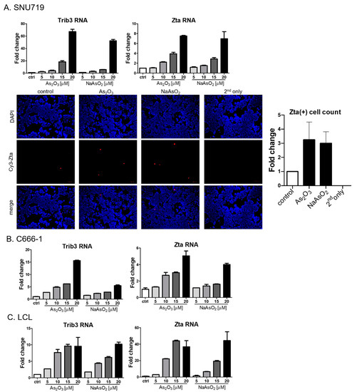 To better assess the generality of the findings with the Akata Burkitt line, we investigated the impact of arsenicals on naturally EBV-infected gastric carcinoma (SNU719) and nasopharyngeal carcinoma (C666-1) cell lines. Similar to the results seen in the Burkitt cell line, Trib3 RNA and Zta RNA increased following As2O3 treatment (Figure 4A,B). However, by immunofluorescence Zta protein was only marginally increased in SNU719 cells, and no increase could be detected in C666-1 cells). Zta RNA expression in an EBV lymphoblastoid cell line was activated by arsenic compounds (Figure 4C), but increased Zta protein expression was not observed following arsenical treatment). Thus, we conclude that the effects of arsenicals on Zta RNA were not limited to lymphoma cells—but note that protein levels varied substantially among cell lines.