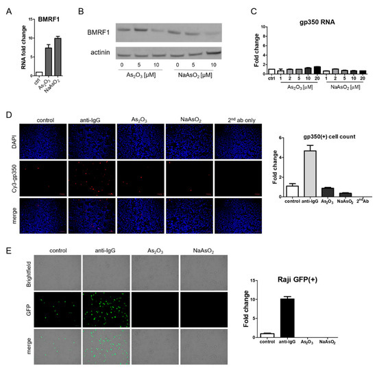 Although EBV Zta RNA and protein expression were induced by arsenic treatment, the effects on BMRF1, a delayed early gene, were quite different. RNA levels increased (Figure 5A) whereas protein levels decreased (Figure 5B). RNA and protein levels (as judged by immunofluorescence) of the late lytic gene gp350 did not increase following arsenic treatment (Figure 5C,D). To further evaluate the impact of arsenicals on lytic infection, we assessed virion production. For this purpose, we relied on the Raji infection assay [24,25]. In this assay, virions from BX1-Akata cells that infect Raji cells lead to the induction of the GFP expression in Raji cells. Lytic induction of BX1-Akata cells with anti-IgG yielded a supernatant that induced GFP expression in Raji cells and served as a positive control as can be seen in Figure 5E. In contrast, the supernatant from arsenical-treated BX1-Akata cells yielded no GFP signal. Thus following arsenic treatment, the immediate early Zta RNA and protein were expressed and the delayed early BMRF1 RNA was induced, but the BMRF1 protein was not detected. The late gp350 RNA was not induced and the protein was not detected and was consistent with a block in delayed early and late gene expression; virion production was inhibited (relative to baseline).