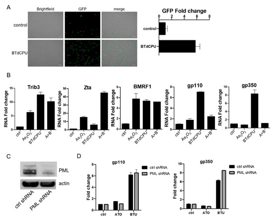 BTdCPU induces EBV lytic gene expression. (A) BX1-Aakta cells were treated with 10 µM BTdCPU, and fluorescence microscopy was used for detecting GFP positive cells after 24 h of treatment. (B) BX1-Akata cells were treated with either As2O3, BTdCPU, or in combination (A+B) for 24 h, and qRT-PCR was performed. (C,D) BX1-Akata cells were transduced with lentiviral particles designed to knockdown PML, and cells were selected by puromycin. Immunoblot was performed to detect PML expression (C), and qRT-PCR was performed 24 h after As2O3 or BTdCPU treatment (D).
