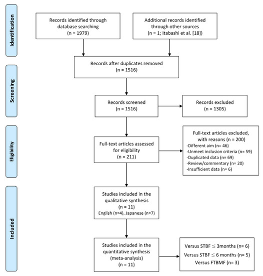 We included studies if they met the following criteria: the mothers were found to be an HTLV-1 carrier by an antibody test; the HTLV-1 antibody tests were performed on their children aged >12 months to <15 years; and the MTCT rate of the intervention group (STBF or FTBMF) was compared with that of the ExFF group (control).