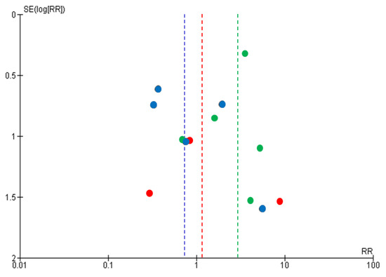 Funnel plots of the included studies. Blue indicates the STBF ≤3 months compared with ExFF, green indicates the STBF ≤6 months compared with ExFF, and red indicates the FTBMF compared with ExFF.