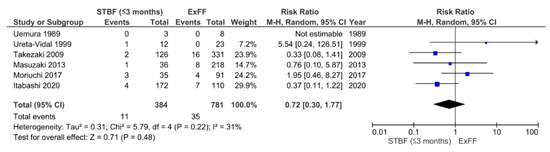 We identified a total of five retrospective studies [21,22,23,24,25] and one prospective [18] study that were eligible for the comparison of STBF ≤3 months and ExFF (Figure 3). There were 11 cases of HTLV-1 positivity among 384 children in the STBF ≤3 months group compared with 35 cases among 781 children in the ExFF group (pooled RR: 0.72; 95% CI: 0.30–1.77; p = 0.48). There was moderate heterogeneity between the studies (I2 = 31%, p = 0.22).
