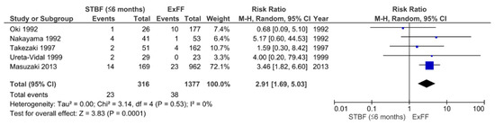 We identified a total of four retrospective studies [22,24,26,27] and one prospective study [28] that were eligible for the comparison of STBF ≤6 months and ExFF (Figure 4). There were 23 cases of HTLV-1 positivity among 316 children in the STBF ≤6 months group compared with 38 cases among 1377 participants in the ExFF group (pooled RR: 2.91; 95% CI: 1.69–5.03; p = 0.0001). There was low heterogeneity between the studies (I2 = 0%, p = 0.53).