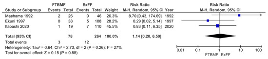 We identified only three prospective studies [18,29,30] that were eligible for the comparison of FTBMF and ExFF (Figure 5). There were three cases of HTLV-1 positivity among 78 children in the FTBMF group compared with 12 cases among 264 children in the ExFF group (pooled RRL: 1.14; 95% CI: 0.20–6.50; p = 0.88). In the study of Maehama et al. [29], the duration of FTBMF was limited to one month, followed by formula feeding. The study of Ekuni [30] did not describe the duration of FTBMF, but the follow-up study by the same authors [31] stated that the mean duration of FTBMF was two months (varying from two weeks to six months). There was moderate heterogeneity between the studies (I2 = 27%, p = 0.26).