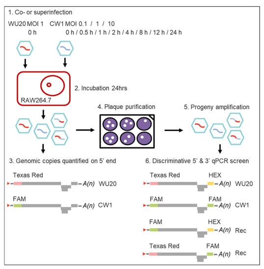 Monolayers of RAW 264.7 cells were prepared in 24-well plates at a density of 5 × 104 cells per well. Working on ice, each well was infected with WU20 (MOI = 1; confirmed via back-titration). After 1 h, the WU20 inoculums (300 µL) were removed and stored at −80 °C. The cells were washed twice with PBS and were infected with CW1 at various MOIs (0.1; 1; 10; confirmed via back-titration) at delays of 0 min (coinfection), 30 min, and 1, 2, 4, 8, 12, and 24 h (superinfections). For coinfections, CW1 and WU20 inoculums in a final volume of 300 µL were simultaneously added to cells. Cells and virus then remained on ice for 1 h, whereupon the inoculum was removed. For superinfections, CW1 inoculums were asynchronously dispensed onto cells at the appropriate delays, whereupon cells and virus remained on ice for 1 h until removal of the inoculums; the cells were then washed twice with PBS and 300 µL DMEMc were added. Twenty-four hours post co-or superinfection, both cells and supernatants were frozen and stored at −80 °C until further analysis.