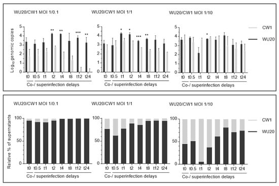 These absolute genomic copy numbers translate into relative ratios of genomic copies that reflect a disproportionate WU20 dominance within the majority of viral populations (Figure 2, bottom panels). A WU20 to CW1 starting MOI ratio of 1 to 0.1 (expected to yield 90% WU20 and 10% CW1 genome copies upon qPCR analysis of the viral population) yielded mean WU20 genomic copy numbers of 3.40 (±0.43), 3.17 (±0.34), 3.33 (±0.40), and 4.27 (±0.05) log10 (accounting for 95.98%, 92.46%, 91.74%, and 95.73% of the population) 24 h after either coinfection (t0) or superinfections with delays of half an hour (t0.5) to two hours (t2). From a superinfection delay of four hours (t4) onwards, WU20 mean genomic copy numbers ranging from 3.28 (±0.56) to 4.24 (±0.01) log10 (99.43 to 99.96% of the population) are juxtaposed against CW1 values of 1.43 (±0.81) to 0.07 (±0.32) log10.