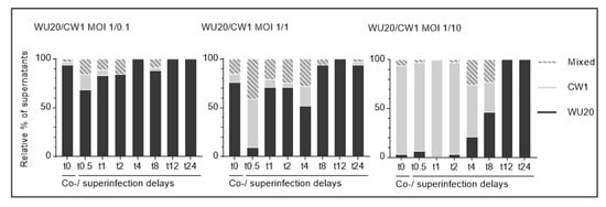 A WU20 to CW1 starting MOI ratio of 1 to 10 (expected to yield infectious progeny virus proportions of 10% WU20 to 90% CW1) resulted in WU20 proportions of 3% following coinfection (t0) and 6%, 0%, and 3% following early superinfection delays (t0.5 to t2). From t4 onwards, WU20 quantities are seen to progressively increase, accounting for 21% (t4), 46% (t8), and 100% (t12 and t24) of infectious virus progenies.