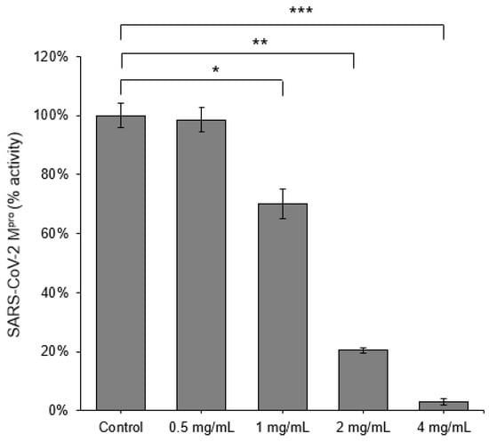 Scutellaria barbata inhibited the protease activity of SARS-CoV-2 Mpro in vitro FRET-based enzyme activity assay of SARS-CoV-2 Mpro in the absence or presence of Scutellaria barbata treatment with two folds series dilution from 0.5 mg/mL to 4 mg/mL. All data were represented as mean ± standard deviation (SD). Statistical significance was calculated using student t-test. ANOVA was performed when multiple comparisons were evaluated. *, p < 0.05. **, p < 0.01. ***, p < 0.001.