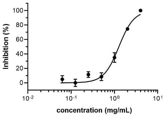 Dose-response curve of SB on SARS-CoV-2 Mpro. SB inhibited SARS-CoV-2 Mpro with half-maximal inhibitory concentration (IC50) of 1.27 mg/mL and Hill slope of 2.5.