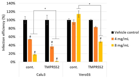 SARS-CoV-2 can enter the host cell via both endosomal and non-endosomal pathways. The endosomal-mediated pathway includes the S protein binding to ACE2 and subsequent dynamin/clathrin-mediated internalization of endosomal vesicles. In addition to the endosomal-mediated pathway, host TMPRSS2 also play critical roles in the non-endosomal entry of SARS-CoV-2 [1]. VeroE6 cell line (monkey kidney epithelial cell line) is used as a standard model for endosomal entry pathway, because this cell line presents relatively high ACE2 expression and low TMPRSS2 expression. Calu3 cell line (human lung cancer cell line), as with the airway epithelial cells, express high amounts of TMPRSS2 and SARS-CoV-2 entry into these cells is dependent on TMPRSS2 [45]. Calu3 and VeroE6 cells with and without TMPRSS2 over-expression were treated with Scutellaria barbata. After 24 h treatment, the cell viability measured by CCK8 assay demonstrated no cytotoxicity for both (Supplementary Figure S1). Our results already demonstrated that SB could potently inhibit TMPRSS2 enzyme activity in vitro (Figure 3). To further investigate whether SB would block SARS-CoV-2 infection through inhibiting TMPRSS2 activity, we first generated the TMPRSS2-expressing cells in both VeroE6 and Calu3 cells. Then, these cells were pre-treated for 1 h with 4 or 8 mg/mL of SB and then infected with the SARS-CoV-2 Vpp and infection efficiency was determined according to luciferase activities after 24 h of infection. The results demonstrated that SB blocked infection of the SARS-CoV-2 Vpp in Calu3 cells, but not in VeroE6 cells (Figure 4). Furthermore, SB showed a higher inhibitory effect in both over-expressing TMPRSS2 cells (Figure 4). These results indicate that SB can inhibit SARS-CoV-2 entry by affecting TMPRSS2 activity.