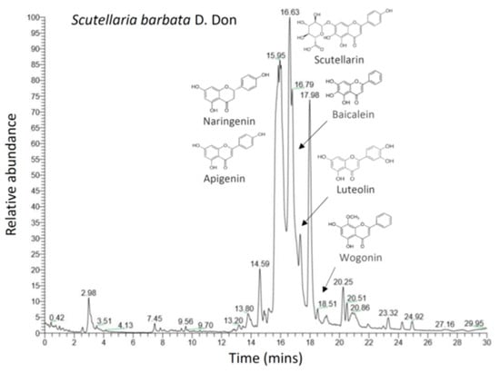 The fingerprint of Scutellaria barbata. Aqueous extracts of Scutellaria barbata was analyzed by LC/MS. The main compositions of individual herbal compounds were indicated by arrows based on the exact molecular weight.