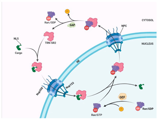 The nuclear transport cycle. In the cytoplasm, cargo/importin complex formation is mediated by the nuclear localization signal (NLS) of the cargo (upper left). In the nucleus the cargo is released upon binding of RanGTP to the importin (lower panel). Next, the importin/RanGTP complex is exported to the cytoplasm where the GTPase activating protein (GAP) hydrolyses GTP to GDP, which subsequently leads to release of importin (upper right). Ran guanine nucleotide exchange factor (GEF) phosphorylates Ran/GDP in the nucleus. The figure is created by https://app.biorender.com (accessed on 22 March 2021).
