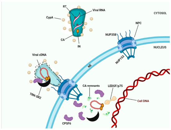 - Bejarano, D.A.; Peng, K.; Laketa, V.; Börner, K.; Jost, K.L.; Lucic, B.; Glass, B.; Lusic, M.; Müller, B.; Kräusslich, H.-G. HIV-1 nuclear import in macrophages is regulated by CPSF6-capsid interactions at the nuclear pore complex. Elife 2019, 8, e41800. [Google Scholar] [CrossRef] [PubMed]
