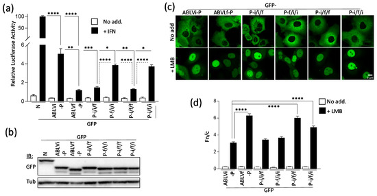 P proteins of ABLVi and ABLVf differ in STAT1 antagonist function and nuclear trafficking. (a) 293T cells were transfected to express the indicated proteins and with plasmids for the IFNα/STAT1-dependent dual-luciferase reporter assay before treatment with or without 1000 U/mL IFNα (16 h) and calculation of luciferase activity (ratio of firefly/Renilla activity; mean ± SD). **** p < 0.0001, *** p ≤ 0.001, ** p ≤ 0.01, * p ≤ 0.05 (Student’s t-test); data representative of ≥3 assays. (b) Expression of GFP and tubulin (Tub., loading control) in lysates from reporter assays was determined by immunoblotting (IB) using the indicated antibody. (c) Cos-7 cells expressing the indicated proteins were treated with or without 5.2 nM leptomycin-B (LMB) before analysis by confocal laser scanning microscopy (CLSM). (d) Images such as those in (c) were analyzed to calculate the ratio of nuclear to cytoplasmic fluorescence (Fn/c, mean ± SEM). **** p < 0.0001, n > 40 cells for each condition.