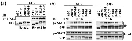 Our data indicated that differences in STAT1 antagonism by ABLV P proteins are dependent on the C-terminal region, which forms part of the CTD that binds to STAT1 [15,17]. We thus hypothesized that ABLVf and ABLVi P proteins might differ in interaction with STAT1. Efficient P protein–STAT1 interaction in cells requires IFN treatment, indicative of high-affinity binding to pY-STAT1 such that P protein selectively targets IFN-stimulated signaling processes [15,21,22]. We thus examined interactions of P proteins with pY-STAT1 by coimmunoprecipitation (IP) of GFP-fused P protein from cells following treatment with IFN for 0.5 h or 16 h (as previously described [22]) and analysis of lysates and IPs by immunoblotting (IB) (Figure 3).