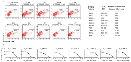 Figure 2. (A) Dose-dependent inhibition of HIV-1 infectivity by PODXL2. HEK293T cells were cotransfected with pHIV(NL4-3) DNA (1 μg) plus the PODXL2 expression vector (0.5 to 400 ng of DNA). Virions were harvested at 48 h and normalized for p24, and viral infectivity was quantified by infecting Rev-A3R5-GFP indicator cells. (B) Virions were assembled in the presence of each individual SHERK protein, and quantified for virus infectivity as in (A). The dose-dependent inhibition of HIV-1 curve by each individual SHREK protein was plotted using results from 2 independent experiments. (C) The 50% inhibition dosage (IC50) for each SHREK protein was calculated based on the averages from the two independent experiments.