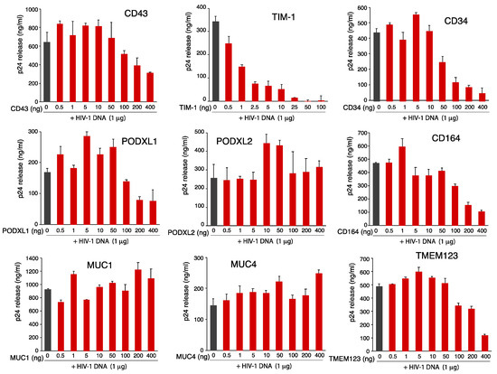 To elucidate the anti-HIV mechanisms of SHREK proteins, we first examined the effects of SHREK expression on virion release in virus producer cells. Previous studies of PSGL-1 have demonstrated that expression of PSGL-1 in virus producer cells had minimal effects on HIV-1 virion release [6]. To examine effects of SHREK proteins on HIV-1 virion release, we cotransfected HEK293T cells with HIV(NL4-3) proviral DNA (1 μg) plus each of the SHREK protein expression vector at varying inputs from 0.5 to 400 ng (Figure 3). The release of virions in the presence of each SHREK protein was quantified. All of the proteins except TIM-1 had minor effects on virion release at doses below 100 ng (Figure 3). CD34, PODXL1, and CD164 [34] inhibited HIV-1 virion release only at high dosages (100 ng and above). TIM-1 potently inhibited virion release at doses as low as 5–10 ng (Figure 3 and Supplementary Figure S12), consistent with a previous report [14]. While not inhibiting virion release at low dosages, all of these proteins, except for MUC1 (IC50, 216.05), effectively blocked virion infectivity with an IC50 at approximately 10 ng and below (Figure 2B,C). These results suggested that, for most of these SHREK proteins, inactivating virion infectivity rather than blocking virion release is a major mechanism.