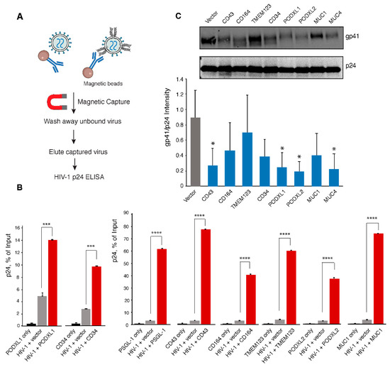 HIV-1 particles were produced by cotransfection of HEK293T cells with pHIV-1(NL4-3) DNA (1 μg) plus 100 ng of vector expressing CD43, CD164, TMEM123, CD34, PODXL1, or PODXL2, or 200 ng of vector expressing MUC1 or MUC4. Empty vector was used to keep the amount of DNA equal in each cotransfection. Virus particles were harvested at 48 h and purified through 10% sucrose gradient by ultracentrifugation (10,000× g for 4 h at 4 °C). Particles were resuspended in LDS lysis buffer (Invitrogen) and subjected to Western blot analysis.
