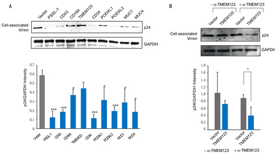 HIV-1 virus particles produced in the presence of PSGL-1, CD43, CD164, TMEM123, CD34, PODXL1, PODXL2, TIM-1, MUC1, MUC4, or empty vector were incubated with HelaJC.53 cells (prechilled at 4 °C for 1 h) at 4 °C for 2 h. The cells were then washed extensively (5 times) with cold PBS buffer and then lysed with LDS lysis buffer (Invitrogen) for analysis by Western blot. The attachment of HIV-1 virus produced in the presence of TMEM123 was also separately tested by pre-incubating the virus with the mouse monoclonal anti-TMEM123 antibody (297617) (ThermoFisher, Waltham, MA, USA) (25 μg/mL) at 37 °C for 1 h, followed by incubation of the virus with HeLaJC.53 cells at 4 °C for 2 h and lysis of the cells with LDS buffer.