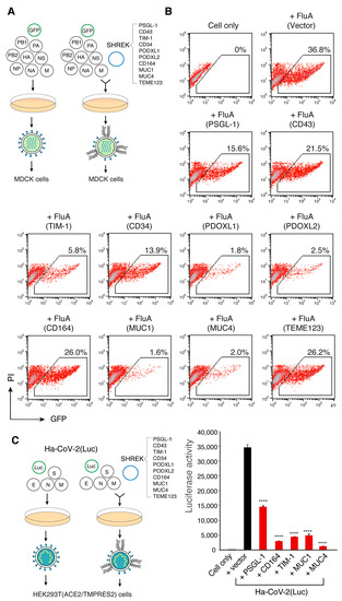 The infectious HIV-1 molecular clone pHIV-1(NL4-3) was obtained from the NIH AIDS Reagent Program. pCMV3-PSGL-1, pCMV3-CD43, pCMV3-CD164, pCMV3-TMEM123, pCMV3-CD34, pCMV3-PODXL1, pCMV3-PODXL2, pCMV3-TIM1, pCMV3-MUC1, pCMV3-MUC4, pCMV3-Empty, pMUC1-HA, pTMEM123-HA and SARS-CoV-2 S, M, E, or N expression vectors were purchased from Sinobiological. The Ha-CoV-2(Luc) vector was described previously [21]. pCMV6-XL5-ICAM1, pCMV6-XL5-CD2, pCMV6-AC-ITGB2, pCMV6-XL5-CD62L were purchased from Origene. The pHW-NA-GFP(ΔAT6) reporter plasmid and the A/WSN/1933 H1N1-derived plasmids pHW2000-PB2, pHW2000-PB1, pHW2000-PA, pHW2000-HA, pHW2000-NP, pHW2000-NA, pHW2000-M, and pHW2000-NS were kindly provided by Dr. Feng Li. For HIV-1 virus production, HEK293T cells were cotransfected in a 6-well plate with 1 μg of pHIV-1(NL4-3) plus the indicated doses of pCMV3-CD164, pCMV3-TMEM123, pCMV3-CD34, pCMV3-PODXL1, pCMV3-PODXL2, pCMV3-TIM1, pCMV3-MUC1, pCMV3-MUC4 or pCMV3-Empty. Supernatants were collected at 48 h post cotransfection. For influenza A-GFP reporter particle assembly, HEK293T cells were cotransfected with pHW2000-PB2, pHW2000-PB1, pHW2000-PA, pHW2000-HA, pHW2000-NP, pHW2000-NA, pHW2000-M, and pHW2000-NS (0.25 μg each); pHW-NA-GFP(ΔAT6) (1.5 μg); and pCMV3-PSGL-1, pCMV3-CD43, pCMV3-CD164, pCMV3-TMEM123, pCMV3-CD34, pCMV3-PODXL1, pCMV3-PODXL2, pCMV3-TIM1, pCMV3-MUC1, pCMV3-MUC4, or pCMV3-Empty DNA (0.5 μg each) in a 6-well plate. Viral supernatants were harvested at 48 h. Hybrid alphavirus-SARS-CoV-2 (Ha-CoV-2) particles were produced by cotransfection of HEK293T cells in 6-well plates with SARS-CoV-2 S, M, N, and E expression vectors (0.3 µg each), Ha-CoV-2(Luc) (1.2 µg), and each individual SHREK-expressing vector or a control empty vector (1.6 µg). Ha-CoV-2 particles were harvested at 48 h post-transfection.