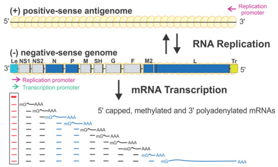 - Whelan, S.P.J.; Barr, J.N.; Wertz, G.W. Transcription and Replication of Nonsegmented Negative-Strand RNA Viruses. Curr. Top. Microbiol. Immunol. 2004, 283, 61–119. [Google Scholar] [CrossRef] [PubMed]