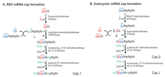 - Ogino, T.; Banerjee, A.K. Unconventional Mechanism of mRNA Capping by the RNA-Dependent RNA Polymerase of Vesicular Stomatitis Virus. Mol. Cell 2007, 25, 85–97. [Google Scholar] [CrossRef]