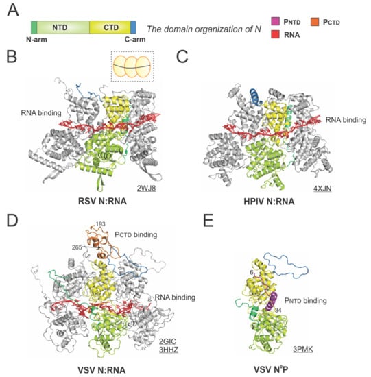 - Jamin, M.; Yabukarski, F. Nonsegmented Negative-Sense RNA Viruses-Structural Data Bring New Insights into Nucleocapsid Assembly. Adv. Virus Res. 2017, 97, 143–185. [Google Scholar] [PubMed]