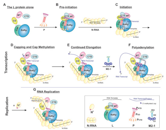 - Ogino, T.; Green, T.J. RNA Synthesis and Capping by Non-segmented Negative Strand RNA Viral Polymerases: Lessons from a Prototypic Virus. Front. Microbiol. 2019, 10, 1490. [Google Scholar] [CrossRef]
