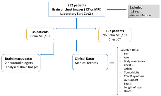 The 232 confirmed COVID-19 patients were divided into two groups: (1) those who underwent a brain CT/MRI scan (n = 35) and (2) those who did not undergo a brain CT/MRI scan, but underwent a chest CT (n = 197).