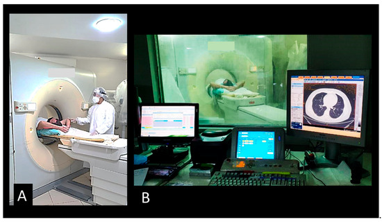 Moments during the performance of a chest computerized tomography of a COVID-19 patient. (A) Patient being positioned in the computerized tomography machine for chest examination without contrast. (B) Photograph of the Computerized Tomography Machine Control Room during a computerized tomography examination of the chest of this patient.