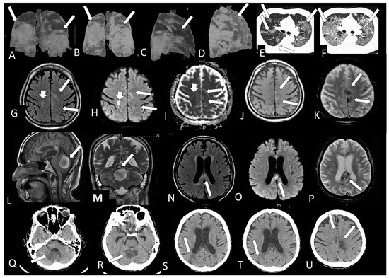 Case 31—The Chest CT on admission shows areas of alveoellar consolidation and ground glass in more than 50% of lung area (arrows A,C,E). Three days later, there was a severe increase of the lung disease (arrows, B,D,F). The brain MRI shows some hyperintense small areas on FLAIR (arrows, G) and in DWI (arrows, H) which are hypointense on ADC-Map (restricted diffusion lesions, arrows, I) in both cerebral hemispheres. Small areas of microbleeding are observed, being hyperintense on T1WI (J, arrows) and hypointense on T2* (K, arrows) localized on the medial part of left pre and postcentral gyrus. There is also a large oval hematoma located at the vermis of the cerebellum, being hyperintense on sagittal T1 (L, arrow) and on coronal T2WI (M, arrow) with peripheric hypointense ring of hemosiderin. Some small lesions, which represent microbleeding (methemoglobin), are also located on the splenium of the corpus callosum hyperintense on FLAIR (N, arrow) and on DWI (O, arrow) being hypointense on T2* (P, arrow). The CT (Q–U) without contrast made one month later showed that the lesions described above on previous MRI are hypointense and that a new sequel in the right parietal lobe (S,T, arrow) had appeared.