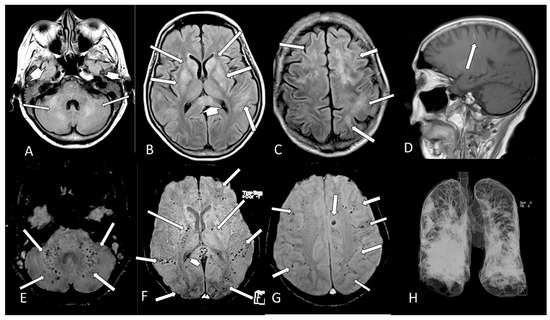 - Radmanesh, A.; Derman, A.; Lui, Y.W.; Raz, E.; Loh, J.P.; Hagiwara, M.; Borja, M.J.; Zan, E.; Fatterpekar, G.M. COVID-19-associated Diffuse Leukoencephalopathy and Microhemorrhages. Radiology 2020, 297, E223–E227. [Google Scholar] [CrossRef]