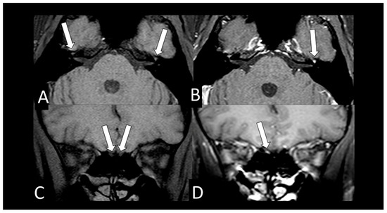 Case 32—The MRI shows both hypointense geniculate ganglions on axial fat suppressed T1 WI (A, arrows), but the left geniculate ganglion has abnormal stronger enhancement on axial post contrast (B, arrow) fat suppressed T1 WI. The coronal fat suppressed T1 WI shows olfactory bulbs with normal hypointense signal (C, arrows), but the post contrast coronal fat suppressed T1WI shows abnormal enhancement in the right olfactory bulb (D, arrow).