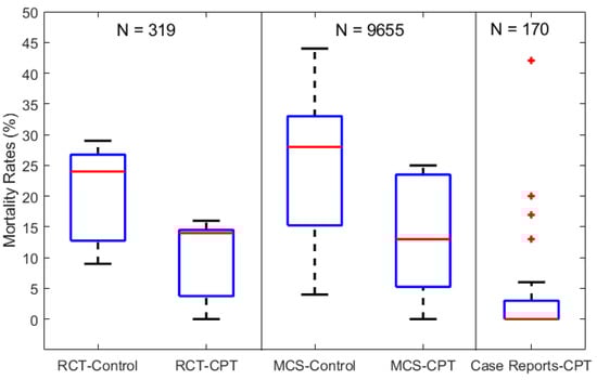 Boxplots of mortality rates in COVID-19 patients from control and CPT recipient groups of RCTs, MCSs, and CRs. The total number of patients included in each category of studies is labeled above as N = 319, 9655, and 170 for the RCTs, MCSs, and CRs, respectively.