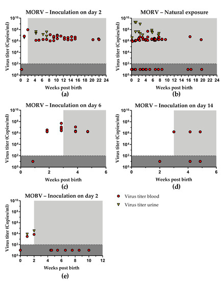 Virus titers in blood and urine of infected Mastomys. Neonates were inoculated with MORV at the age of 2 days (a) or exposed to the virus (b) via direct contact with infected individuals. Furthermore, Mastomys were inoculated with MORV at 6 days (c) or 14 days (d) post-birth. (e) Neonates were inoculated with MOBV at the age of 2 days. Blood and urine were collected at regular intervals and tested for the presence of MORV or MOBV RNA with qRT-PCR. Ct values were converted into copy numbers using a standard curve. Blood samples are depicted as red dots and urine samples were indicated by yellow triangles. Plasma was inactivated and analyzed for the presence of MORV- or MOBV-specific antibodies with indirect immune fluorescence. The presence of virus-specific antibodies is marked by the light grey area. The limit of detection for the qRT-PCR assay is shown by the dotted line and dark grey coloration. Negative samples have been assigned a default value below the detection limit.