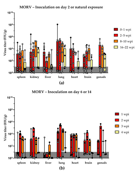 Organ titers of MORV-infected animals: (a) virus titers of organs from Mastomys that have been infected via inoculation 2 days post-birth (black dots) or via natural contact with infected individuals (white dots); (b) virus titers of organs from animals that have been inoculated 6 days (black dots) or 14 days (white dots) post-birth. The different time points post-infection are shown in different colors, and all samples falling into this time frame have been pooled. The limit of detection is shown by the dotted line and dark grey coloration. Titers are shown as box and whisker plots with all data points shown. Virus titers of negative samples (below the limit of detection) appear to vary due to the differences in organ weight, which is taken into account for the virus titer per gram organ.